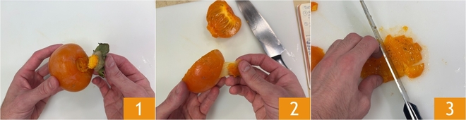 Para preparar el risotto de caquis y taleggio comienza con la limpieza de los caquis: elimina el tallo 1, divide los caquis por la mitad y quita la piel con cuidado 2, luego pícalos con un cuchillo hasta obtener una pulpa suave e irregular 3.