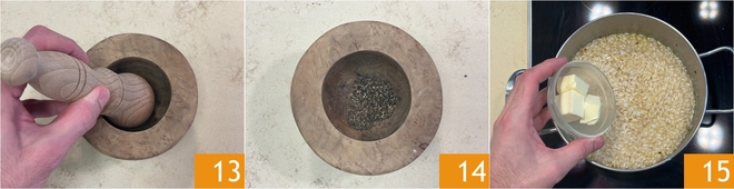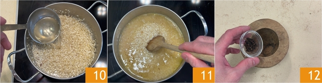 Comienza a mojar el arroz con el caldo caliente, un cucharón a la vez 10, continuando a mezclar durante la cocción 11. Mientras tanto, coloca los granos de pimienta negra en un mortero 12.