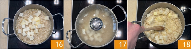Agrega también el taleggio 16 y cubre con la tapa durante un minuto 17, luego apaga el fuego y mezcla enérgicamente 18 hasta obtener una manteca cremosa y homogénea.