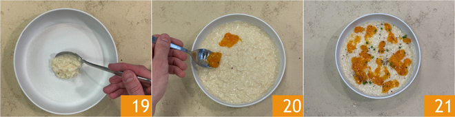 En este punto, sirve el risotto distribuyéndolo en el centro del plato 19, luego completa con unas cucharadas de pulpa de caquis preparada al inicio 20, una pizca de pimienta negra machacada 20 y finalmente algunos tallos de cebollino para dar frescura y color. ¡Tu risotto de caquis y taleggio está listo para ser servido 21!
