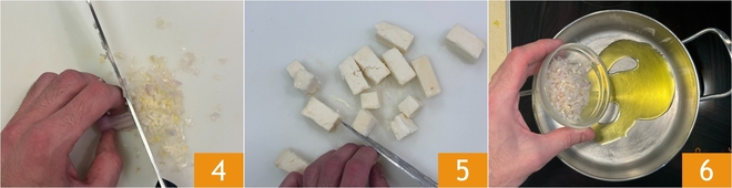 Limpia y pica finamente la chalota 4, luego corta también el taleggio en trozos, así estará listo para la manteca final 5. En una cacerola dora la chalota con un poco de aceite de oliva virgen extra 6.