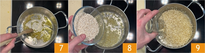 Cuando la chalota esté suave 7, añade el arroz y deja que se tueste durante unos minutos, removiendo para que no se pegue 8. Sumerge con el vino blanco 9 y deja que se evapore.