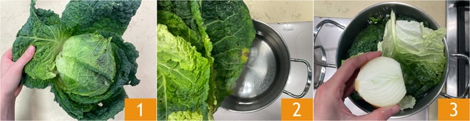 Para preparar el risotto de col rizada y salchicha lo primero que debes hacer es preparar el caldo que necesitarás para cocinar el arroz: separa las hojas externas de la col rizada 1 y colócalas en una olla llena de agua 2 junto con media cebolla 3, luego lleva a ebullición a fuego medio.