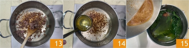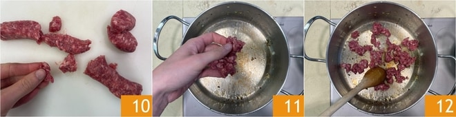 Ahora quita la tripa de la salchicha y desmenúzala con las manos 10. Pon la salchicha en la misma cacerola donde has sofrito la col rizada 11 y sofríela a fuego alto por unos minutos, removiendo a menudo 12.
