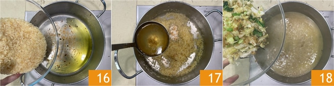 En este punto calienta un hilo de aceite en la misma cacerola y tuesta el arroz por un par de minutos 16, luego añade un cucharón de caldo 17 y añade la col rizada sofrita anteriormente, reservando un poco para la decoración 18.