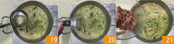 Continúa cociendo el arroz añadiendo un cucharón de caldo por vez, asegurándote siempre de que el anterior haya sido absorbido 19. Ajusta de sal y pimienta 20. Al final de la cocción añade la salchicha, reservando un poco para la decoración 21.