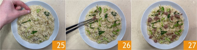 Emplata y decora con la col rizada 25 y la salchicha reservadas 26. ¡Sirve inmediatamente tu risotto de col rizada y salchicha 27!