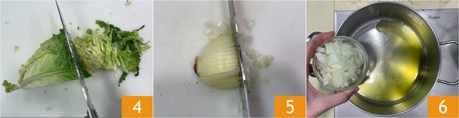 Reduce el resto de la col rizada a tiras 4, luego corta la otra mitad de la cebolla en brunoise 5. Coloca la cebolla en una cacerola donde hayas calentado un chorrito de aceite 6.