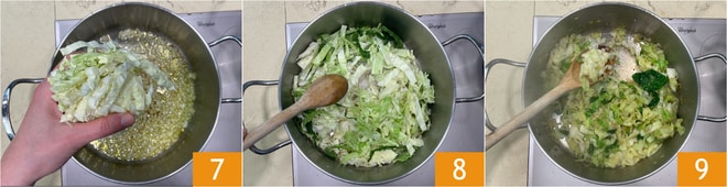 Cuando la cebolla esté dorada añade las tiras de col rizada 7 y sofríelas a fuego medio-alto por unos minutos 8. Una vez se haya ablandado, retira la col rizada de la cacerola 9 y resérvala.