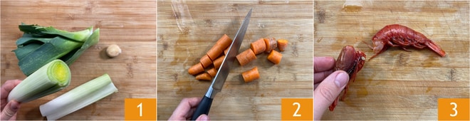 Para preparar el risotto con gambas y puerros, limpia el puerro cortando las hojas verdes y la base, luego sepáralo para eliminar la parte más externa 1. Lava y conserva los restos. Lava y corta en trozos la zanahoria 2. Finalmente, limpia las gambas y reserva los caparazones 3.