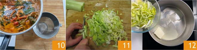 Filtra el caldo con un colador 10 y mantenlo caliente. Corta el puerro en rodajas finas 11 y deja que se brasee bien en la mantequilla 12.