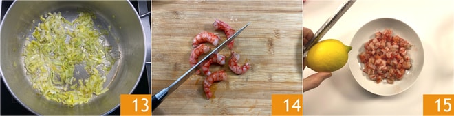 Una vez dorado 13, resérvalo. Corta las gambas en trozos pequeños 14 y sazónalas con sal y ralladura de limón 15.