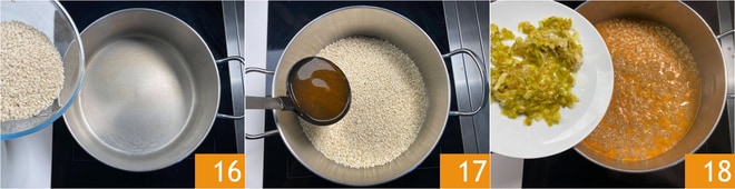 Tuesta el arroz en seco 16 y comienza a cocinarlo agregando el caldo poco a poco a medida que se absorba 17. Después de unos 10 minutos, añade el puerro braseado 18 y lleva el arroz a su cocción.