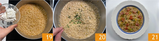 Una vez que el risotto esté cocido, mézclalo fuera del fuego con la ricotta de cabra 19 y perfuma con mejorana 20. Sirve el risotto añadiendo las gambas en los platos 21.