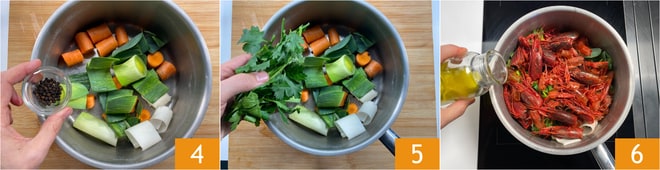 En una cacerola, prepara el caldo: añade los restos de las gambas y el puerro, la zanahoria, sal y pimienta 4, una ramita de perejil 5. Añade también los restos de la limpieza de las gambas, un poco de aceite y tuesta todo a fuego alto 6.