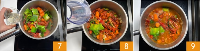 Riega con el vino 7. Una vez que el alcohol se haya evaporado, cubre con agua fría 8 y deja cocinar durante una hora 9.
