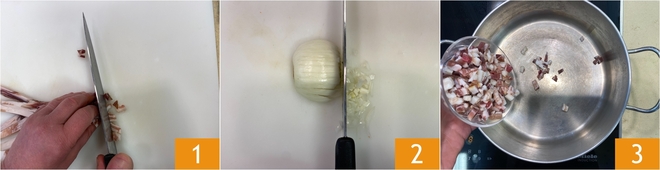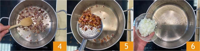 Soletadla a fuego vivo 4 hasta que esté dorada 5 y luego colocadla sobre papel absorbente para que pierda el exceso de grasa. En la misma olla, aprovechando precisamente la grasa de la panceta, haced pochar la cebolla picada durante unos minutos hasta que esté tierna 6.