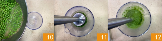 Cuando estén listos, verted la mitad en un vaso alto 10 y trituradlos con la batidora de mano 11 hasta obtener una crema lisa 12. Reservad el resto para la guarnición final.