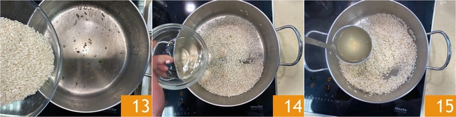Ahora pasad al arroz: tostád el Carnaroli en la misma cacerola, sin añadir grasas, durante un par de minutos 13, desglasad con el vino blanco 14 y dejad evaporar el alcohol. Empezad a añadir el caldo gradualmente 15 removiendo con frecuencia.