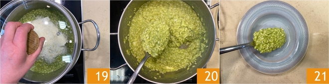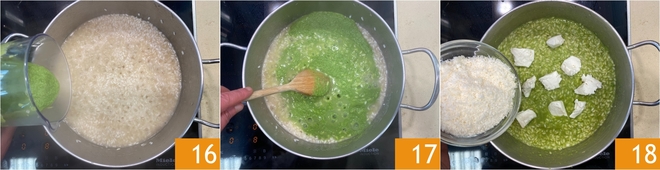 A mitad de la cocción, incorporad la crema de guisantes 16 continuando hasta que el grano quede al dente 17. Una vez apagado el fuego, mantecad con mantequilla y Parmesano 18.