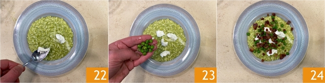 Adornad con montoncitos de crescenza 22, los guisantes enteros reservados 23 y la panceta crujiente. El risotto de guisantes, crescenza y panceta crujiente está listo para disfrutar 24.