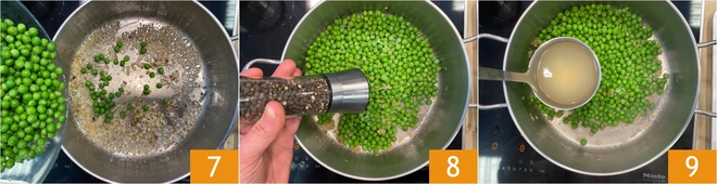 A continuación, añadid los guisantes 7 y dejadlos cocer durante unos siete minutos con una pizca de sal, pimienta 8 y un cucharón de caldo vegetal 9.