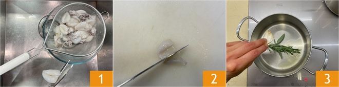 Para preparar el risotto guisantes y sepias pequeñas, limpiad las sepias, separad los tentáculos de la cabeza 1, retirad la parte con pico y ojos, cortad las cabezas a la mitad para tener un tamaño más pequeño 2. En una sartén verted un chorrito de aceite, un diente de ajo machacado, las ramitas de romero y de salvia 3.