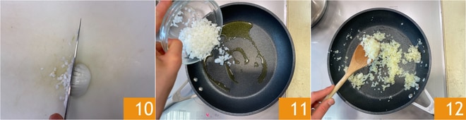 Picar las dos cebollas 10, dejadlas pochar en una sartén 11 con poco aceite y sal, retirad la mitad de la cebolla picada 12.