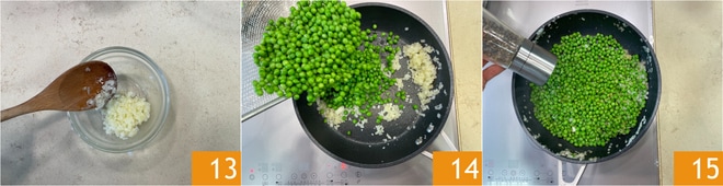 Reservadla 13. Verted en la sartén, con la cebolla que queda, los guisantes 14, salpimentad 15, saltead todo junto durante unos 5-8 minutos, así los guisantes estarán cocidos.