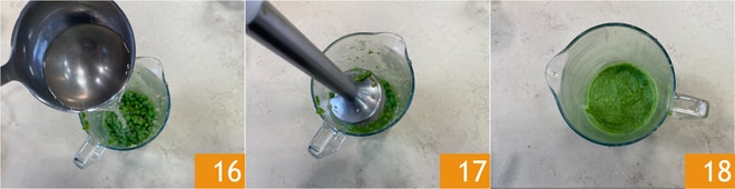 Poned los guisantes en una jarra 16, añadid un cucharón de caldo caliente 17 y batid con la batidora de inmersión para obtener una crema 18.