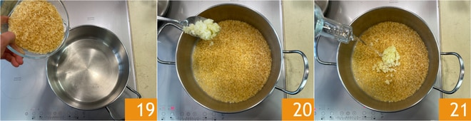 Verted el arroz en una cacerola bien caliente 19, mezclad hasta que el grano esté muy caliente, añadid la cebolla pochada reservada anteriormente 20, desglasad con el vino blanco restante 21.