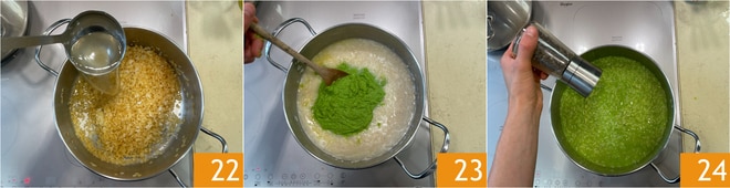 Añadid poco caldo caliente por vez 22, sal y llevad a cocción añadiendo caldo según sea necesario. Cuando esté casi cocido, incorporad la crema de guisantes 23, ajustad de pimienta 24.