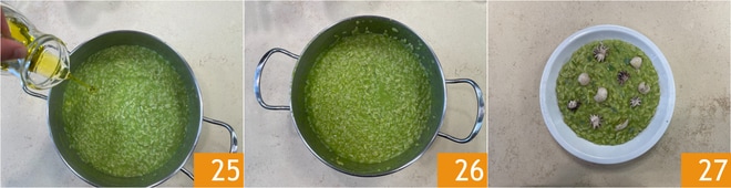Retirad del fuego y mantecad el risotto con aceite 25, y mezclad 26. Servid el risotto con las sepias pequeñas cocidas en sartén y servid de inmediato 27.