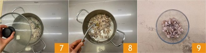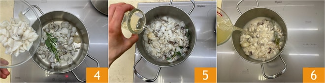 Verted las sepias pequeñas 4, saltead dos minutos, desglasad con 40 g de vino blanco 5, añadid un poco de caldo 6.
