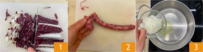 Para preparar el risotto con radicchio y salchicha, corta el radicchio en tiras 1, elimina la tripa de la salchicha y desmenúzala 2. Vierte el aceite de oliva virgen extra en una cacerola, añade la cebolla picada y déjala pochar a fuego lento 3.