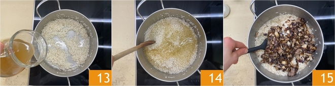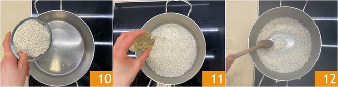 En una cacerola, añade el arroz carnaroli y tuéstalo 10. Cuando los granos estén muy calientes, rocía con vino blanco 11. Deja que el alcohol se evapore manteniendo el fuego medio alto 12.