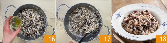 Manteca con el aceite de oliva virgen extra 16. Ajusta de sal y pimienta, da una última removida con una espátula 17 y tu risotto con radicchio y salchicha está listo para disfrutar 18!