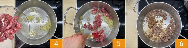 Después de unos 3 minutos, añade la salchicha sin la tripa 4. Mantén la temperatura medio alta y, con una espátula, remueve a menudo 5. Continúa cocinándola durante unos 7 minutos o hasta que esté bien dorada 6.
