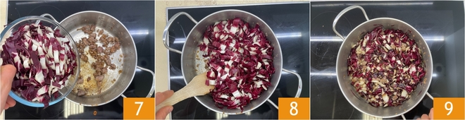 En este punto, puedes añadir el radicchio cortado en tiras 7. Remueve bien con una cuchara 8, deja cocinar durante otros 3 minutos y reserva 9.