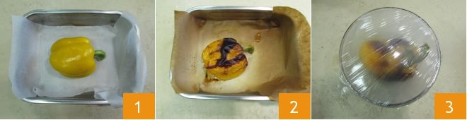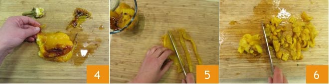 Una vez que los pimientos se hayan enfriado, eliminad la piel exterior y las semillas 4, luego cortadlos primero en tiras de 1 cm 5 y luego en trozos de 3-4 cm de longitud 6.