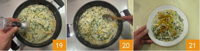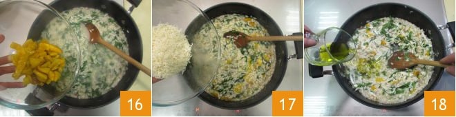 Cuando falten 4-5 minutos para el final de la cocción, añadid dos tercios de los pimientos 16, luego apagad el fuego y mantecad el risotto con la ricotta salata rallada 17 y 30 g de aceite 18.