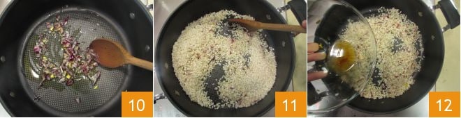 Ahora podéis ocuparos del arroz: poned una cacerola en el fuego y calentad el aceite a fuego lento, luego añadid la cebolla y dejadla rehogar durante 2-3 minutos 10. Incorporad el arroz y tostádlo durante 4-5 minutos removiendo frecuentemente para evitar que se queme 11. Desglasad con el agua del pimiento 12
