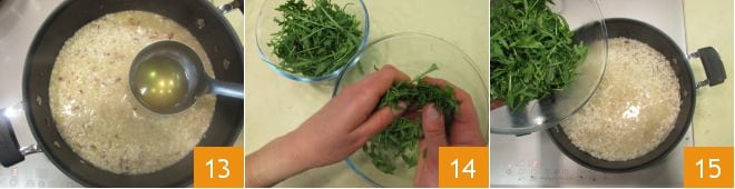 y justo después mojáis con 2-3 cucharones de caldo vegetal caliente 13. Continuad la cocción ajustando la sal y mojando al gusto con más caldo vegetal. Cuando el risotto esté a mitad de cocción, trocead a mano la rúcula 14 y añadidla a la cacerola 15.