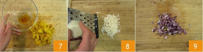 Recoged el líquido de cocción porque lo necesitaréis más tarde 7. Antes de pasar a la cocción del arroz rallad también la ricotta salata de oveja con un rallador de agujeros grandes 8. Finalmente, limpiad y picad la cebolla roja 9.