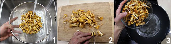 Para preparar el risotto amarillo con rebozuelos, lava las setas bajo agua corriente 1, sécalas con un paño de cocina y parte por la mitad las más grandes 2. Pocha los rebozuelos en una sartén con 40 g de mantequilla 3 durante unos minutos y sazona ligeramente.
