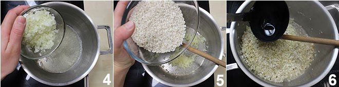 En una olla grande derrite los restantes 40 g de mantequilla y dora la cebolla finamente picada 4. Añade el arroz y tuéstalo durante unos minutos removiendo para que no se pegue 5. Durante la cocción, riega el arroz con el caldo, añadiendo un cucharón de vez en cuando 6.
