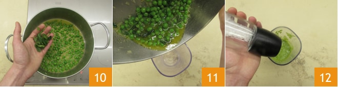 Termina la cocción, apaga el fuego y añade al compuesto no demasiado seco las hojas de menta 10. Transfiere a un vaso de batidora de inmersión 11 y tritura hasta obtener un compuesto liso y homogéneo, ajusta de sal 12 y reserva.