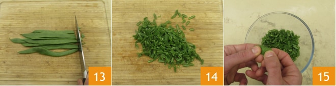 En este punto lava, luego recorta las judías verdes 13 y córtalas finamente 14. Ponlas en un cuenco y aromatiza con un poco de menta troceada a mano 15.