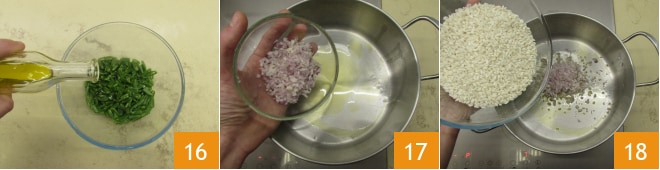 y condimenta con un chorrito de aceite 16. Mezcla y reserva. Ahora nos ocupamos del risotto. En una cacerola añade un chorrito de aceite, los 40 g de chalota que sobraron 17 y calienta con una pizca de sal. Después de aproximadamente 1 minuto añade el arroz 18 y comienza a tostarlo durante unos minutos mezclando a menudo.