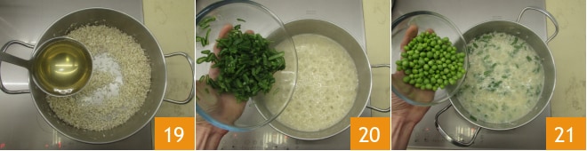 Moja con el caldo caliente poco a poco 19 asegurándote de que la parte líquida esté siempre a un palmo por encima del arroz. A mitad de la cocción añade las judías verdes 20 y los guisantes 21.